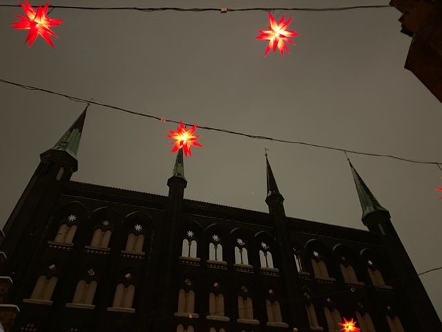Die ganze Stadt ist weiss und Backsteinschönheit. Am Boden Matsch und Rutschen. Ich schlittere verlangsamt, aber Augen auf nach oben in eine wirkliche Zauberstadt. Natürlich weihnachtet es auch überall. Rote Sterne gegen die dunklen Rathausmauern.