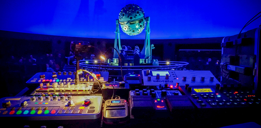 The musician Stefan Gubatz dedicates an entire performance to the topic of space. Using analogue synthesisers and effects devices, as well as digital tools, samples, and noise, Gubatz explores the temporal and spatial boundaries of the Infinity Dome.