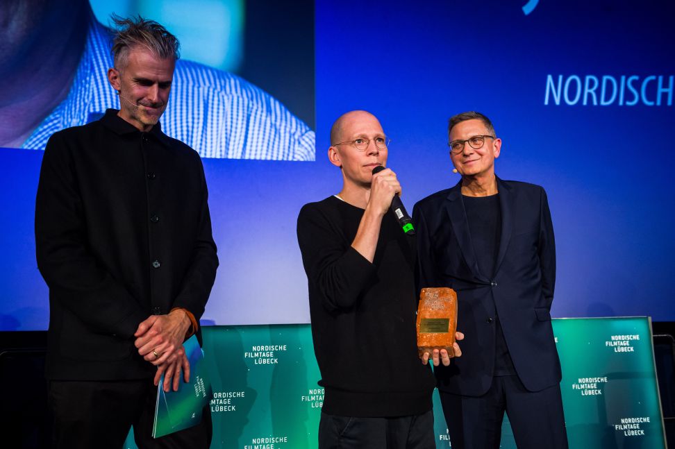 Regisseur Carl Olsson nimmt stellvertretend für Roy Andersson den Ehrenpreis der 65. Nordischen Filmtage Lübeck entgegen. Von links nach rechts: Fred Scott (Laudatio), Carl Olsson, Thomas Hailer (Künstlerischer Leiter) © Nordische Filmtage Lübeck / Olaf Malzahn